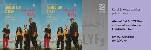 Korsi & der Kulturbunker Köln laden am Donnerstag, 2. Oktober 2025, zu einem besonderen Abend im Rahmen der KINDA x Palestine Music Space Fundraiser Tour „Tales of Resistance“ ein – mit Ahmed Eid und der ILYF Band.