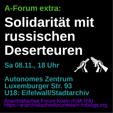 Das Anarchistische Forum Köln möchte euch einladen zu einer Solidaritätsveranstaltung für Deserteure, die sich dem russischen Kriegsdienst entzogen haben. Mit aktuellen Informieren über deren Situation möchten wir Möglichkeiten der antimilitaristischen Unterstützung angesichts des Angriffkrieges des Putin-Regimes aufzeigen.