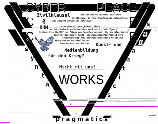 Angesichts einer zunehmenden KI-tisierung des Krieges und Militarisierung sozialer Medientechnologien, VR-Technologien, Computerspiele, generativer KI-Systeme, Interface-Designs, von digitalen Medien und Technologien, die an der KHM erforscht, gelehrt und künstlerisch praktiziert werden, formen sich zunehmend Fragen nach der gesellschaftlichen Verantwortung jener, die mediale Werke und Inhalte entwerfen und Medien und Medientechnologien künstlerisch erforschen und gestalten.